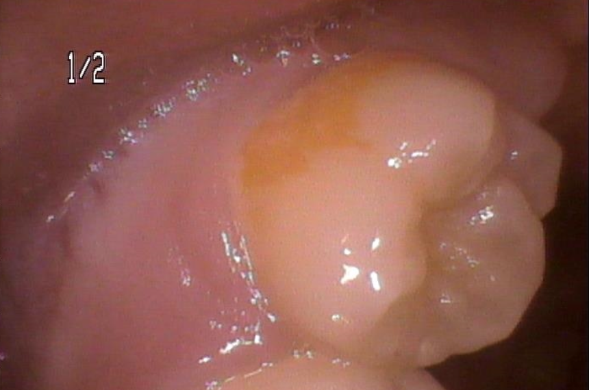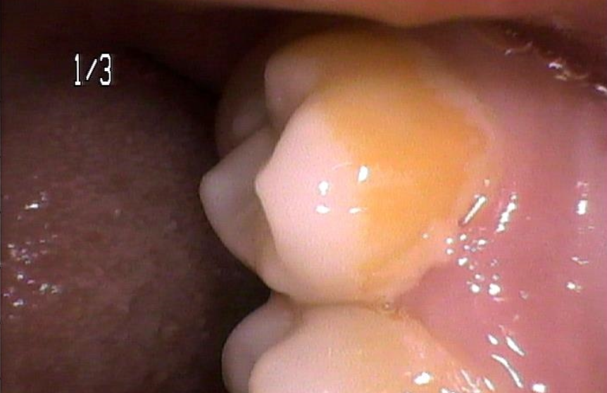 この写真は上の12歳臼歯といって、名前の通り12歳くらいで生えてくる第二大臼歯という永久歯なのですが、オレンジ色に変色している部分がお分かりになるかと思います。