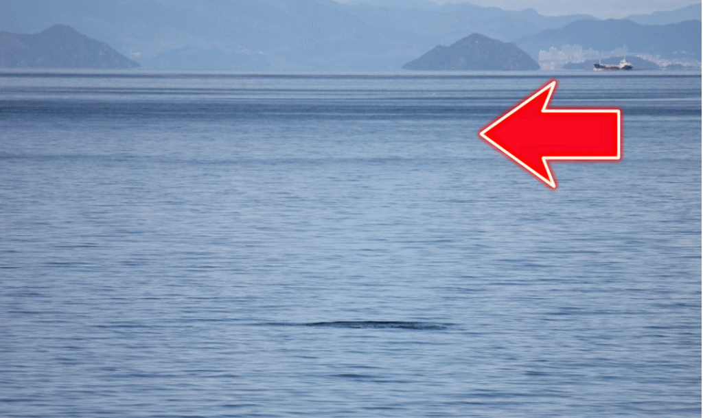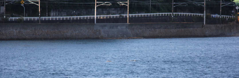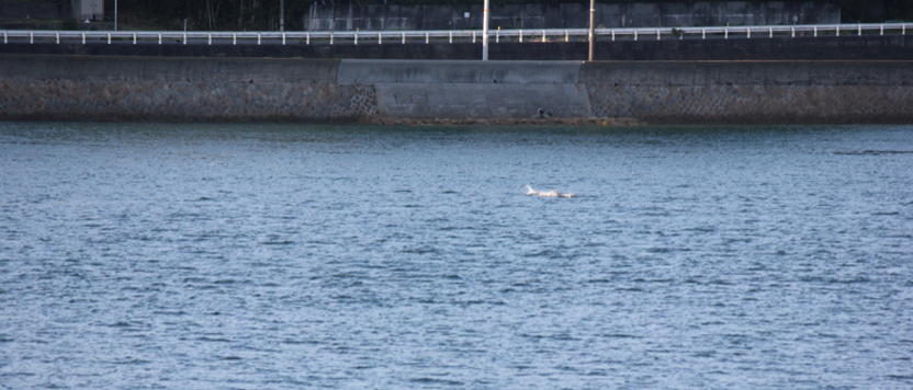 出航してから10分くらい経った時だったでしょうか?航路の300m位北側の海面から突然1頭のスナメリさんが息継ぎのために背中を見せました。しかし私はまさかこんなに早く観られるとは思わず、あっけにとられてしまい、カメラを構えてもいませんでした。