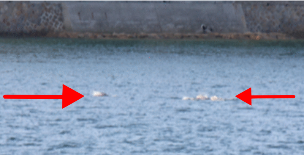 右に2頭?3頭にも見えます。スナメリさんの親子ですかね?少し離れて左にもう1頭います。